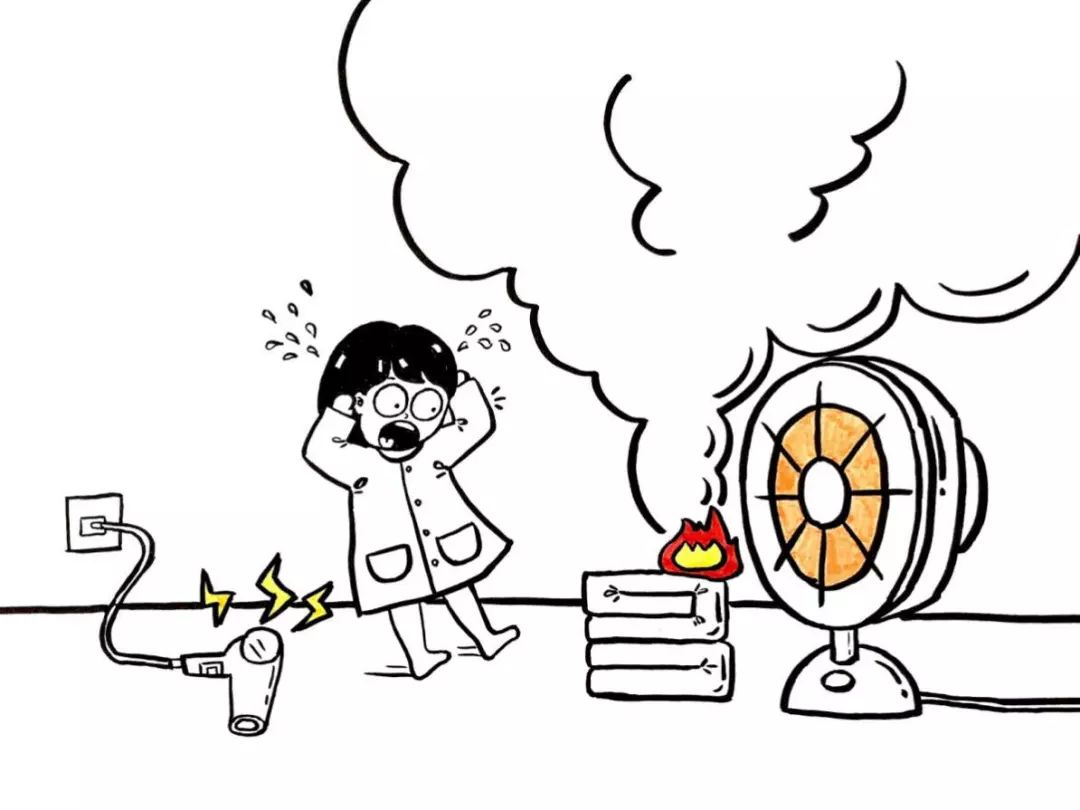 熱得快在開水瓶中持續工作會將水燒干,繼續干燒會引起火災;取暖器近距離接觸衣物2分鐘就會著火;電吹風對準棉被工作2分鐘就會使棉被燒焦。同時老舊建筑內電線老化,使用大功率電器極易造成火災。
